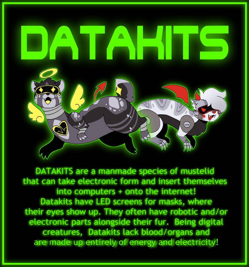 [READS: DATAKITS are a manmade species of mustelid that can take electronic form and insert themselves into computers + onto the internet! Datakits have LED screens for masks, where their eyes show up. They often have robotic and/or electronic parts alongside their fur. Being digital creatures, Datakits lack blood/organs and are made up entirely of energy and electricity!]
